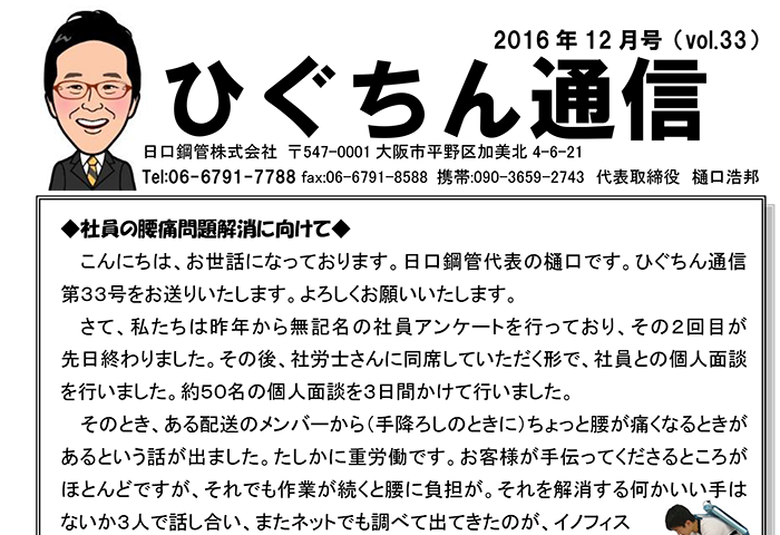 ひぐちん通信 ひぐちん通信 vol.33 を公開しました。 2016.12.16 ひぐちん通信 📄 PDFでご覧いただけます。 4-丸パイプ ロール切断:19.1×1.2 前の記事 5-バタ角パイプ・対角切り 次の記事 ひぐちん通信 vol.44 を公開しました。 2017.11.13