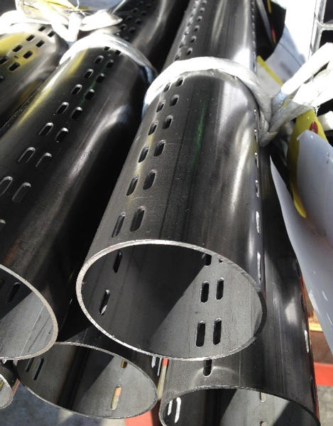 丸パイプのスリット加工S2B(シングル両面)とW2B(ダブル両面)の加工。別注でシングル+ダブルの加工も可能です。今回は楕円穴でのシングル180度、ダブル180度の4面加工。穴のスタート位置は5、残しは65。加工可能な最長は3500となっております。